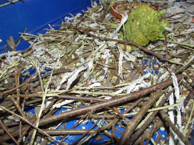 Tak tohle znám, takovýhle binec z větví jsem u agoušů mívala také, to jsou přímo přeborníci v rozkousávání větviček. Člověk by nevěřil, že je umějí úplně nanitkovat.