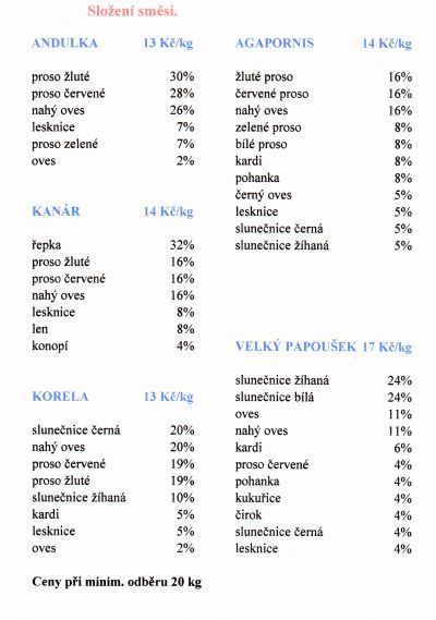cone (neregistrovaný)18.12.2012, 19:41:54xxx.xxx.156.5pro J.Kudela - ukázka směsi pro velké papoušky, kontakt vám pošlu meilem ( případným dalším zájemcům také, zmíněný výrobce směsí je z Ostravy a jezdí i na přerovskou burzu druhou neděli v měsíci)