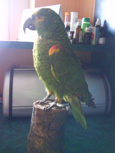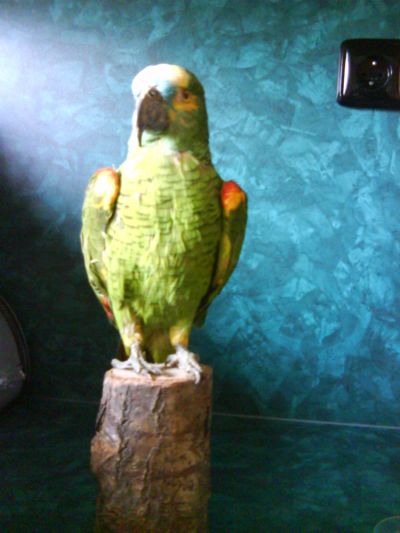 Včera jsem měl možnost vidět vycpaného amazoňana modročelého. Byl jsem u známého a ten má strejdu, který loví zvířata. Jezdí a zařizuje si střílení třeba i v Africe, Americe atd. Když jsem přijel, tak mi známí řekl, že mi chce něco ukázat. Za chvilku přinesl vycpaného amazoňana modročelého. Většinu úlovků si nechává, ale tohoto amazoňana známemu nechal. Kdysi jsem byl přímo v zbírce vycpaných zvířat tohoto ´´lovce´´ a tehda tam měl z papoušků vycpaného alexandra čínského a Papouška senegalského. Mimo to samozřejmě i jiné zvířata (medvědy, vlky, jeleny atd.).