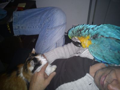 Tak u nás je buď puštěný papoušek nebo 2 psi.Pořád se bojím to zkusit pohromadě.