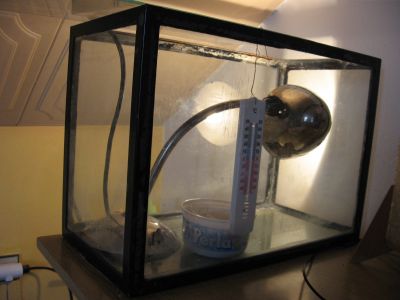 Jelikož můj problém s mláďaty vznikl náhle, tak nějaká možnost inkubátoru nebyla možná, není to zrovna levná záležitost, teda aspoň si to myslím. Proto jsem to vyřešla jinak a doufám, že to není zas tak špatné. Korelku jsem měla v umělé misce v hobllinách a tuto misku jsem dala to akvária, které už nepoužívám na rybičky. Dovnitř jsem dala obyčejnou lampu, kterou mívám na psacím stole, která svým teplem ze svícení zahřívá prostor, ale která nesvítí přímo na mláďata. Ještě jsem si ke stěne hned vedle misky dala obyčejný teploměr, abych mohla sledovat teplotu vevnitř a nakonec jsem akvárium přiklopila sklem, aby se teplo drželo vevnitř. Ale mám tam malou mezeru nakraji pro větrání. Přiložím foto.