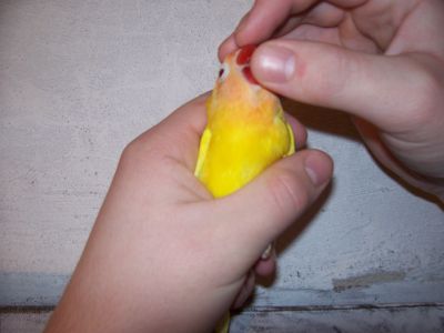 Dále bych porovnal tohoto jedince s jedincem agapornise škraboškového. Protože agapornis škraboškový je cca 15 cm velký, zatím co agapornis hnědohlavý je přibližně 13,5 cm, nebo 14 cm velký, teď si přesně nejsem jistý. Každopádně by měl být viditelně menší. Protože se jedná o lutino jedince, který pokud není párován se silnější mutací, tak by měl být značně menší, proto bych ho raději porovnával například s šedou mutací a. škraboškového, která je dost prokřížena a pokud není opět párována se silnější mutací, tak by měl být pták značně menší. Proto bych porovnával právě tyto mutace. Blbě by se tento jedinec porovnával například s přírodním, nebo modrým jedincem, kteří jsou geneticky nejsilnějšími a postavově většími ptáky.