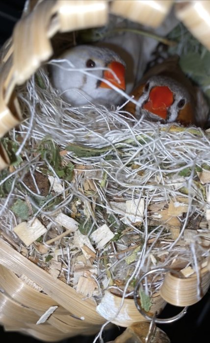 Já ty košíčky moc nemusím, ale chápu, že v kleci není místa nazbyt. Lepší by byla polootevřená budka s umístěním venku na kleci. Zkuste jim ty vajíčka, pokud nejsou poškozená, dát do hnízda. Jako podestýlka je nejlepší kokosové vlákno a nízký mech, případně různé traviny.