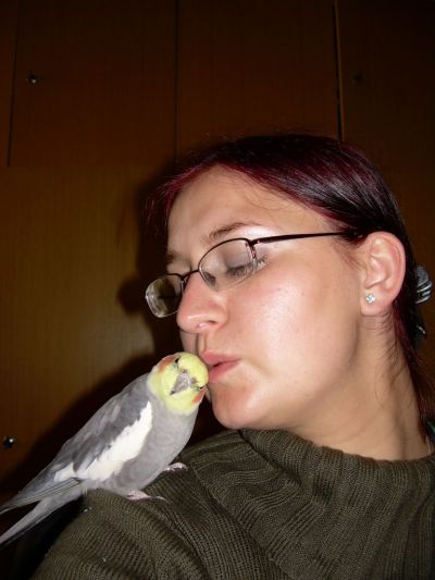čtvrtým rokem máme doma korelu. Po počáteční nedůvěře se velmi ochočila, bývala puštěná celý den, létala volně po bytě až do večera, nechávala se hladit po hlavičce, zajímala se se o naše činnosti, jídlo atd. Protože jsem bývala nejvíce doma, vybrala si mě jako "paničku" a všude musela se mnou, chodívala jsem po bytě stále s korelou na rameni.