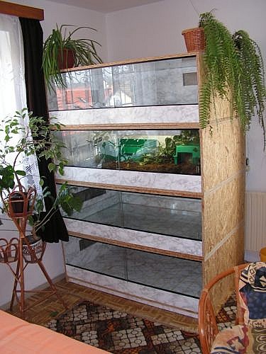 Prodám terarijní stěnu o rozměrech 135 x 185 x 90 cm (d x v x š) Jedná se o čtyři terária postavená na sobě. Jsou vyrobená z OSB desek tl. 18 mm. Z vnitřních stran jsou polepené omyvatelnou tapetou. Spáry jsou vylepené silikonem. V jednom teráriu je na dně skleněná vana. Dvě terária ještě nabyla používána. Vhodné pro chov větších hadů. Cena jen za materiál byla 16000 Kč. Cena dohodou. Email: p.sott@seznam.cz, tel: 728 916 488, www.pythonsott.wbs.cz