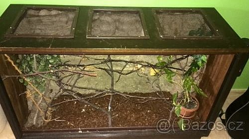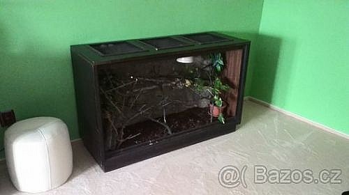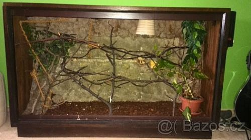 Prodám hezké tera ŠxVxH 118x77x45. Jde o podomácku upravenou vitrínu, tmavé dřevo+sklo, vnitřní zadní část je pískovaná montážní pěna+polystyren, namontován je nástavec na UV zářivku. Prodám vč. teploměru a vlhkoměru od Exo Terra.