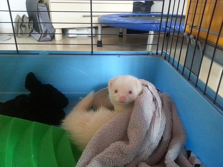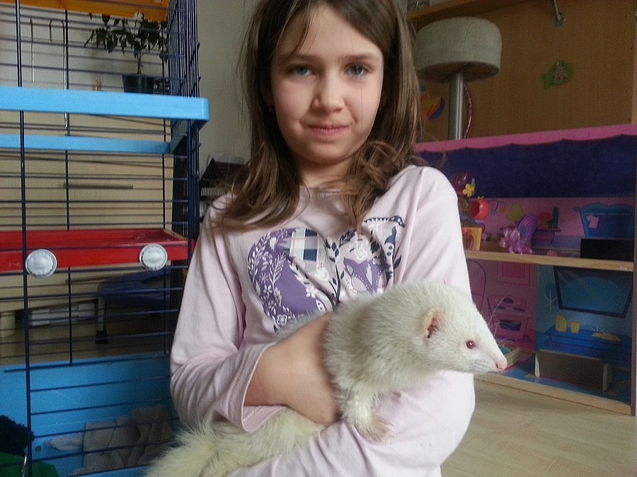 Roční albín samice, odčervená, očkovaná. Je velmi mazlivá a hravá. V případě zájmu velká nová klec se záchodem viz.foto. Původní cena klece 3729 Kč. Nyní za dva tisíce.
