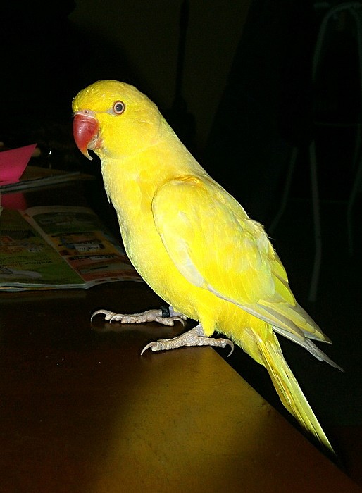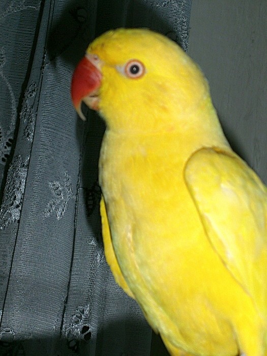 Papoušek je starý necelé dva roky a začíná se mu tvořit kroužek kolem krku --> samec. Má nádherné, nepoškozené peří kromě největšího ocasního péra, které ale v nejbližší době vypadne a naroste nové. Zobák je lehce šupinatý, ale to je u těchto ptáků běžnou záležitostí. Je vhodný i na odchov zdravých, krásných mláďat i na výstavy. Ochočený je lehce, tzn. že si bere baštu z ruky, občas i přiletí na ruku, začíná a snaží se už i mluvit, ale bohužel zatím na sebe nenechá sáhnout, pohladit se. Myslím, že tento "problém" by se dal časem odstranit po navázání důvěry papouška k Vám.