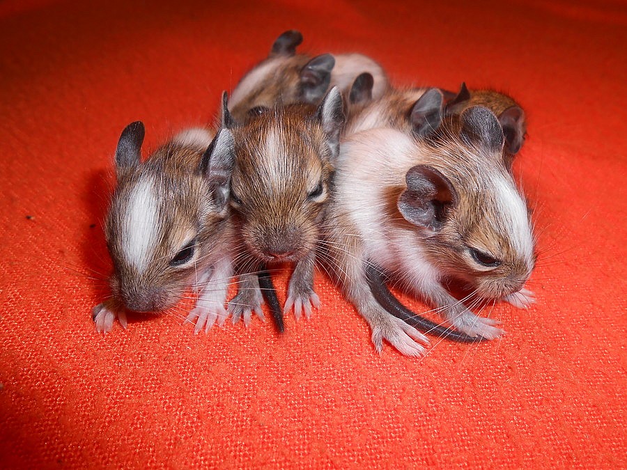 Chovatelská stanice Deguland nabízí k rezervaci strakatá mláďata osmáků degu z vrhu B. Máme samičky i samečky, kteří se narodili 31. 5. Miminka z tohoto vrhu vlastní všechny barevné geny (Agouti, White, Sand, Blue). Všechny důležité informace o osmáčcích a podmínkách prodeje, naleznete na webových stránkách, kde je nabídka pravidelně aktualizována.