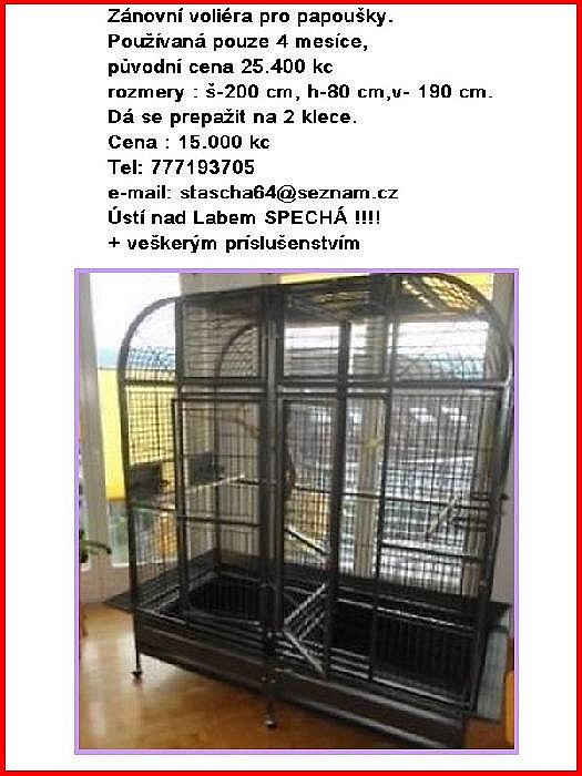 Nabízim skoro novou voliéru. Byla jen 4 měsíce použita, proto ve výborném stavu.Dá se rozdělit i na dvě klece. Rorměry: V 180 cm, Š 200 cm, H 80 cm. Pořizovací cena: 25400,- Prodejní cena: 15000,- ( při rychlém jednání možná sleva)