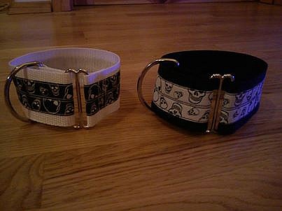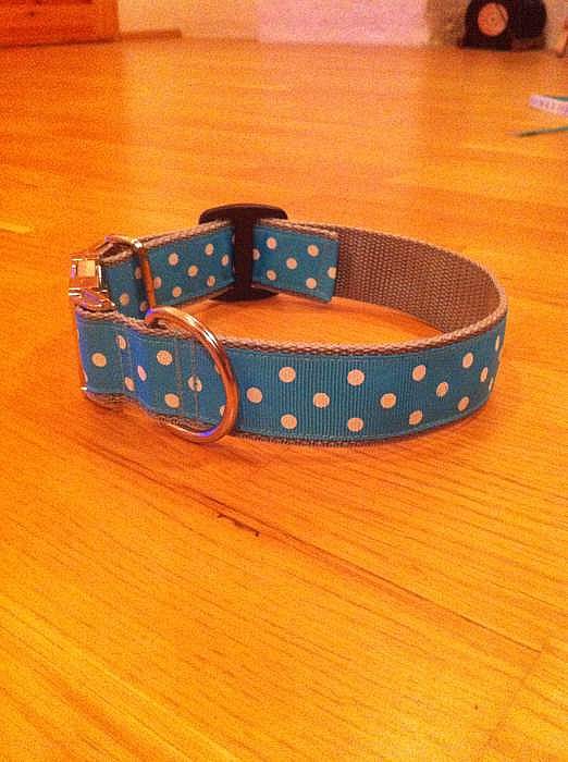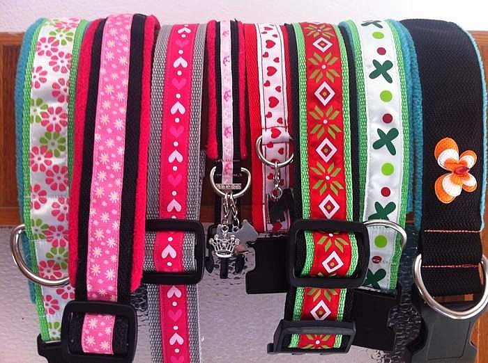 1) Květinový obojek, růžový- obojek s rypsovou stuhou, podšitý jemným fleecem. Černý popruh. Rozměry: délka cca 50cm šířka cca 4cm