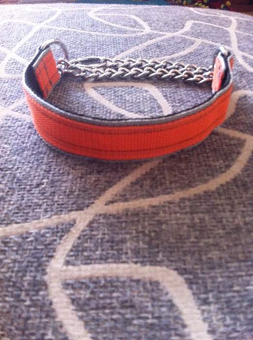 7) Obojek s motýlkem- Podšitý jemným fleecem. Černý popruh. Ozdoba- oranžový motýlek. Rozměry: délka cca 59-63 cm šířka cca 5cm