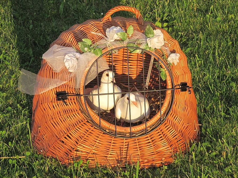Nabízím pár svatebních holubic ve svatebně nazdobeném koši či kleci k příležitosti Vaši svatby. 700,-Kč/pár, Zdeněk Jastřembský 776 666 211