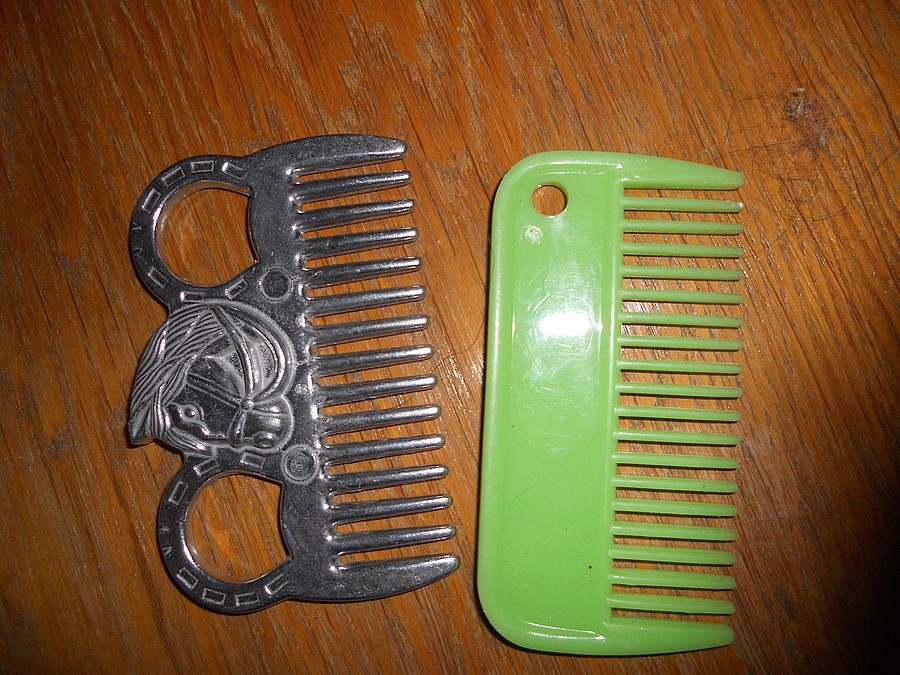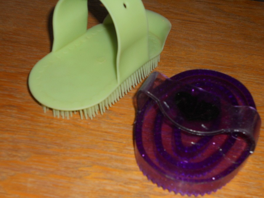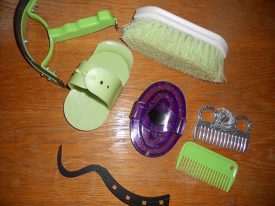 Plastová stěrka, kartáč, hřbílko a hřeben na hřívu – každý kus za 50 Kč.