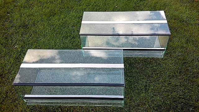 6 terárií - šířka 120 cm, hloubka 50 cm, výška 30 cm. Základna sklo tloušťky 6 mm, boky, záda a strop 5 mm, dvířka 3 mm. Větrání pod dvířky v celé délce...