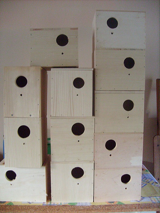 Prodám hnízdící budky pro střední a malé papoušky. (Korely, zpěváky, agapornise apod.) Budky pro andulky mají důlky na vajíčka. Vlastní výroba.