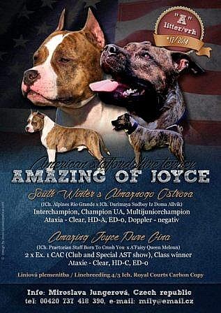Americký stafordšírský teriér - CHS Amazing of Joyce kennel zadá štěňata s PP - 2 pejsky z výborného liniového spojení. Odběr možný již nyní, jsou odčervená, 2x očkovaná, Euro pet pas, průkaz původu, výbavička - krmivo, obojek,vodítko, dečka s pachem. Výb. exteriér a povahy po rodičích, socializace v bytě, zvyklá na děti, nezáv. návštěvy vítány. Vhodná na výstavy, sport i jako mazlíček. Cena 18.000 Kč