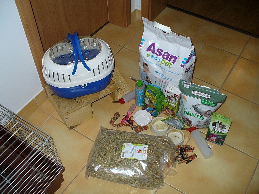 Klec pro morče, zakrslého králíka, velikost 75x43x38 cm včetně přepravky na přenášení, ASAN jako podestýlka, seno, různé krmivo, napáječek, misky na vodu. Vše možno vidět na foto. Klec je po morčeti.