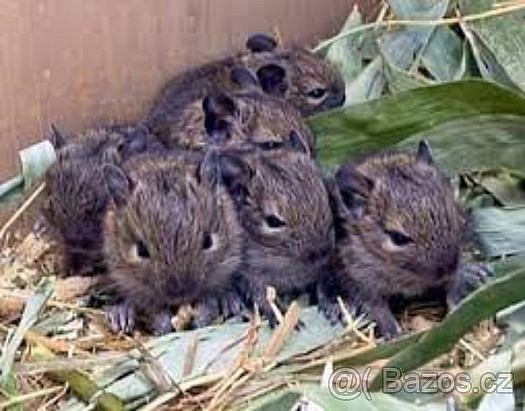 Nabízím k prodeji malé osmáčky degu (barevná varianta Aguti). Ochočeni a naučeni na ruku. Odběr možný ihned. Oba rodiče jsou nepříbuzní. Prosím o kontakt na můj mail: svejcarova.j@seznam.cz. Doporučuji brát alespoň po dvou, jsou to hodně společenská zvířátka :)