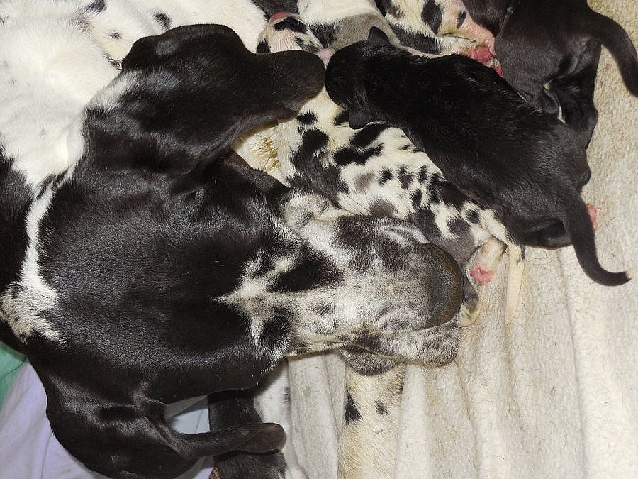 Německá doga - štěňátka černá a skvrnitá z perspektivního spojení o:C.I.B.Mult.Ch. Bodyguard Catley Ranch m:Cia z Novej hory, štěňátka se narodila 27.4.2015, k odběru v červnu, kompletně očkovaná, odčervená, s europasem