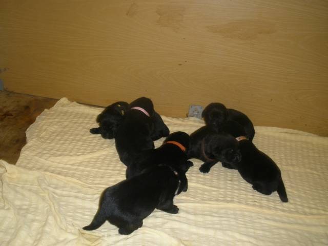 Nabízím čistokrevná černá štěnátka, 4 fenky a 3 pejsky. Matka čistokrevná černá bez PP, otec čokoládový s PP. Oba rodiče u nás k vidění. Budou očkovaná, odčervená, k odběru 15.8.
