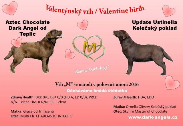 Krásná tmavěčokoládová štěňátka po prověřených rodičích, velmi klidné povahy. MULTICh. English Touch Brown Derby (FR)HD A, ED 0, oči - vše negativní, plnochrupý, APR prcd - clear, EIC - clear, HNPK - clear Ornella Olivery Kelečský poklad HD A, ED0 Odběr štěňátek od 8. 2. 2015 Web: http://www.dark-angels.cz Bereme rezervace na čokoládová štěňátka termín narození unor-Valentýn, odběr počátkem dubna.