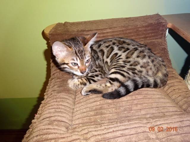 Zadám bengálského kocourka s PP Silesianhill Bentley PK-def N/N jako luxusního mazlíčka či do malého chovného programu. Ze spojení: matka Bohemianhill Fiona of Silesianhill /CZ/ otec Aloona Cyriacus of Silesianhill /PL/. Oba rodiče u nás k vidění. Rodiče testování na HCM, PK-def. Po matce je možná nositelem jedné kopie Charcoal genu Apb/A a nositel seal lynx C/cs. Kocourek je čipovaný , má mezinárodní pas a bude kompletně očkovaný, několikrát odčervený. Do nového domova odejde s výbavičkou na první dny a doživotní chov. Servis je samozdřejmostí. Koťátka z naší chov. Stanice jsou zvyklá na běžný chod domácnosti. Web: http://www.bengalcattery.eu