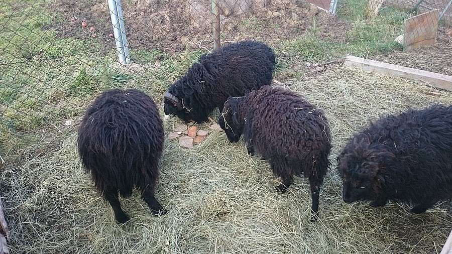 Prodám ouessantské ovce. Dva berani (jeden podvázaný) a dvě ovečky černé barvy. Stáří je cca 2 roky.