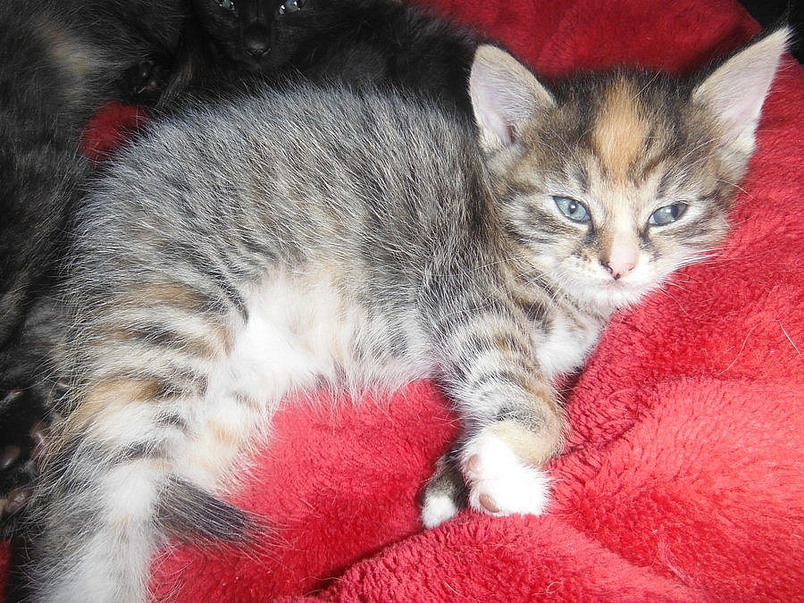 Narodila se nám tři koťátka.Dvě kočičky(zleva) a kocourek(vpravo).Matka je celá mourovatá a otec černý,s bílými tlapkami a stříbřitým tělem.Hledám pro ně vhodný domov.Jsou teprve měsíc stará.Nechodí ven,jsou doma,přikrmují se.Venku nebyla a zatím na bedýnku neumí.Kočička je tmavá,na čumáčku má hnědou barvu a má stříbrné tělíčko.Druhá je nejsvětlejší,více mourovatá,bílé tlapky a čumáček.Kocourek je nejtmavší. Černá hlavička,tmavší tělíčko.