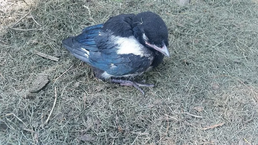 Mládě straky obecné.