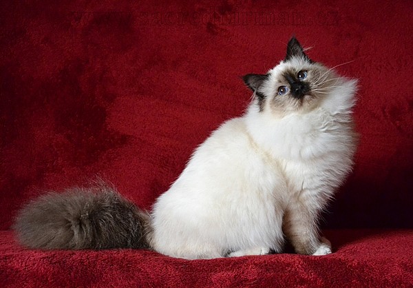 Birma posvátná - atraktivní polodlouhosrstá kočka s modrýma očima a bílýma ponožkama. Velmi mazlivá kočka, přátelská, neuráží se. Nenáročná na péči o srst, vhodná i pro nezkušené. Koťata na chov i na mazlíčka s odznaky v barvě modrá, lila, čokoládová a černohnědá (seal). Odchov v bytě, koťata budou zvyklá na běžné ruchy, na malé psy a naučená čistotě. Odběr koncem září. Kupní smlouva. Více na www.sacredbirman.cz, tel. 607821115