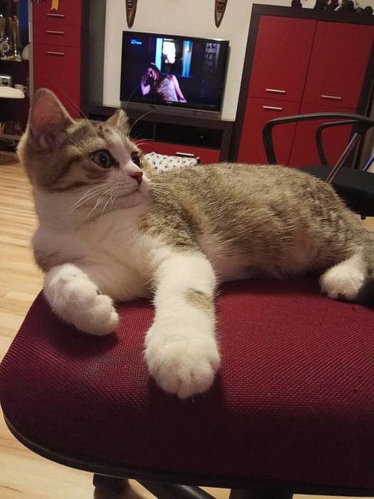 Asi půlroční kocour, hodný, ale v kontaktu s cizími lidmi opatrný, ošetřený proti parazitům, rozvakcinovaný. Tel.: 777214680