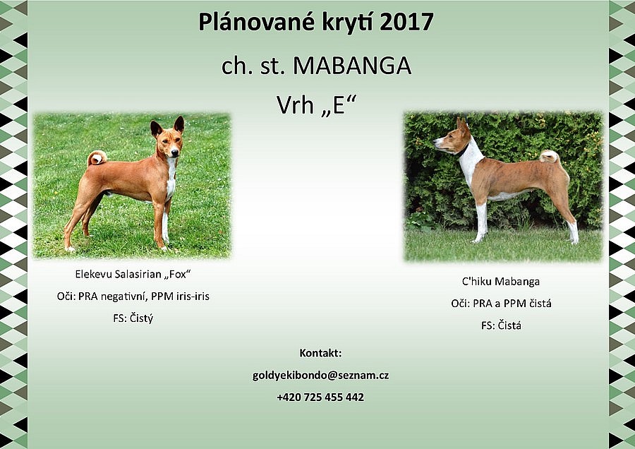 CHS Mabanga bere záznám na štěňata basenji plánovaná na podzim/zima 2017. Očekáváme narození červenobílých a žíhaných štěňat, výstavně i sportovně nadějných. Rodiče jsou zdravotně testováni. Pouze pro vážné zájemce. Nezávazná návštěva vítána. Chovatelský servis samozřejmostí. Více info http://www.goldyekibondo.estranky.cz/ nebo tel. +420725455442