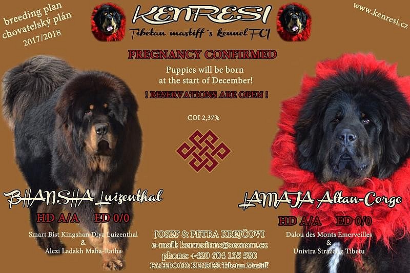 Chovatelská stanice Kenresi přijímá rezervace na štěňata Tibetské dogy s PP.Krytí proběhlo v zahraničí z důvodu přínosu nové krve do chovu.Otec Ch.Bhansha Luizenthal HD A/A ED 0/0, matka Ch.Lamaja Altan-Corgo HD A/A ED 0/0.Štěňata se narodila 6.12.2018. Při odběru budou kompletně oočkovaná, odčervená s PP a passportem. V naší chovatelské stanici klademe důraz na socializaci, štěňata vyrůstají v domácím prostředí a jsou v každodenním kontaktu s dětmi.Pro více informací a fotografií nás kontaktujte.