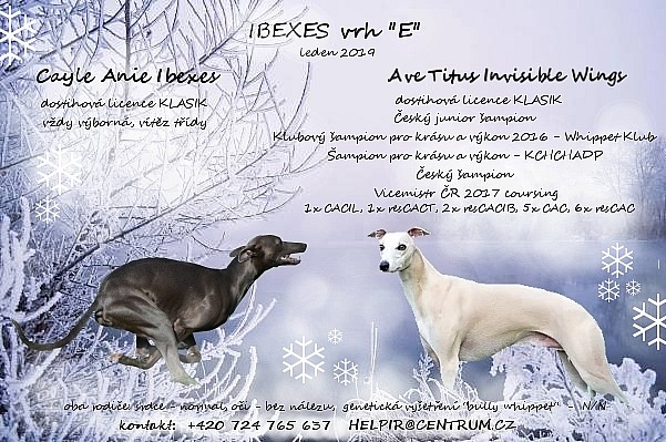 Poslední volný pejsek ELF TITUS IBEXES v modré barvě po výstavních i sportovních rodičích. Vhodný na coursing, agility, výstavy, oba rodiče dostihová licence KLASIK. Oba rodiče vyšetření srdce - normal, vyšetření očí - clear, genetické vyšetření myostatin mutace - bully whippet - negativní. Pejsek je samozřejmě několikrát odčervený, 2x očkovaný, čipovaný s PET pasem.