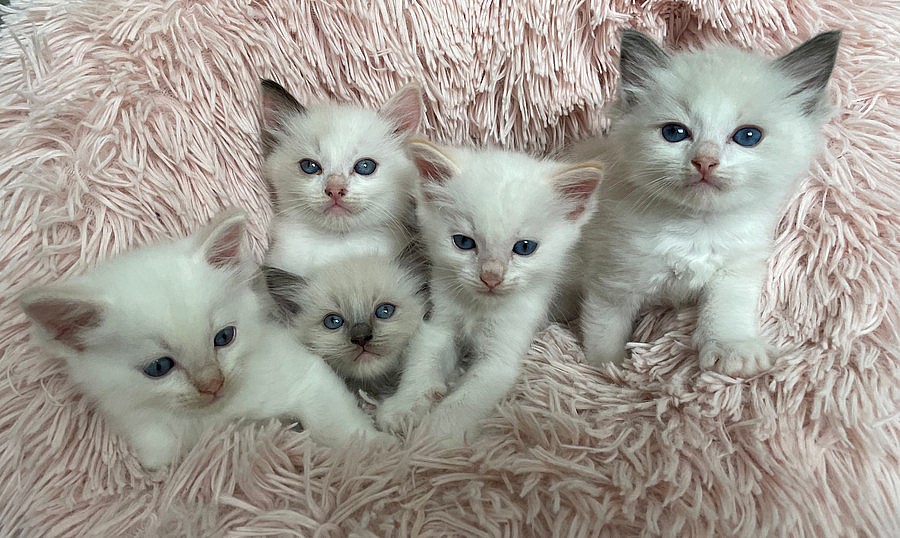 Jen do milujících rodin odhodlaných jim věrně sloužit nabízíme koťátka ragdoll bez P.P. Narozena 10.6. Poctivě rozmazlováná, vyrůstajicí v úzkém rodinném kruhu. Vyhledávají kontakt a mazlení. Umí používat záchůdek. Papkají kvalitní granulky Purizon a vařené masko. Volní jsou tři kluci. Koťátka půjdou do nových domovů odčervená a naočkovaná. Nové majitele pečlivě vybíráme a nezávazná návštěva je samozřejmě možná.