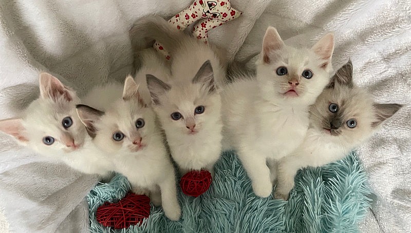 Jen do milujících rodin odhodlaných jim věrně sloužit nabízíme koťátka ragdoll bez P.P. Narozena 10.6. Poctivě rozmazlováná, vyrůstajicí v úzkém rodinném kruhu. Vyhledávají kontakt a mazlení. Umí používat záchůdek. Papkají kvalitní granulky Purizon a masko. Volní jsou už jen dva kluci. Koťátka půjdou do nových domovů odčervená a naočkovaná. Nové majitele pečlivě vybíráme a nezávazná návštěva je samozřejmě možná.
