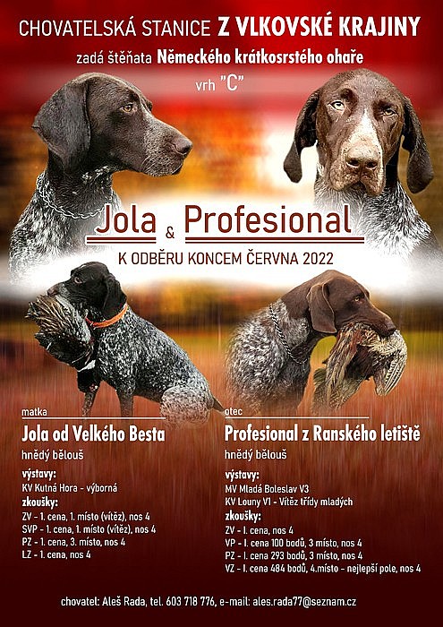 CHS z Vlkovské krajiny nabízí štěňata NKO po pracovně výborných rodičích. Matka: Jola od Velkého Besta - Klubová výstava: výborná, Zkoušky: ZV,PZ,LZ,ZVP,vše I.cena, nos 4. Otec: Profesional z Ranského letiště - KV: výborný, Vítěz třídy mladých, MV: Výborný, Zkoušky: ZV,VP,PZ,VZ,vše I.cena, nos 4. K odběru koncem června. Kontakt: Aleš Rada, tel.: 603 718 776. Okres Praha - západ.