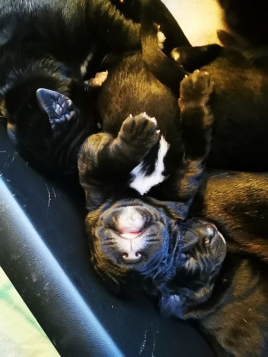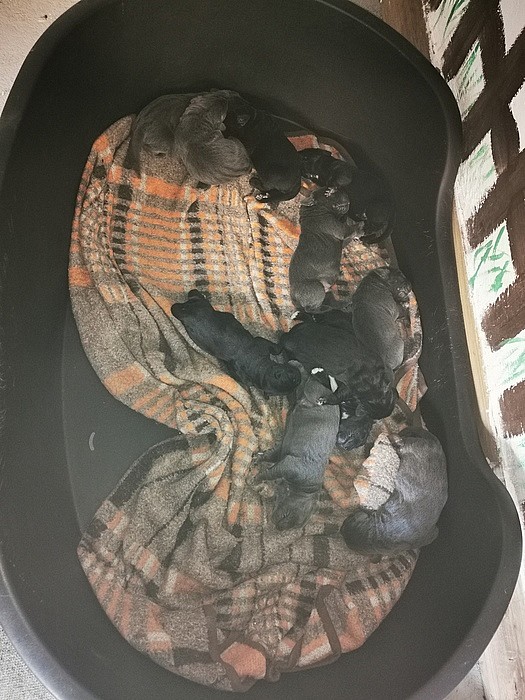 Nabízím k prodeji štěňátka cane Corso 6 fenek 5 pejsků. 6 modrých a 5 černých. Odběr začátkem července. Štěňátka budou naockovana odčervená. Prohlídka po domluvě vítaná. Cena černých 10tis.modre 11tis.v případě zájmu volejte na číslo 605905945