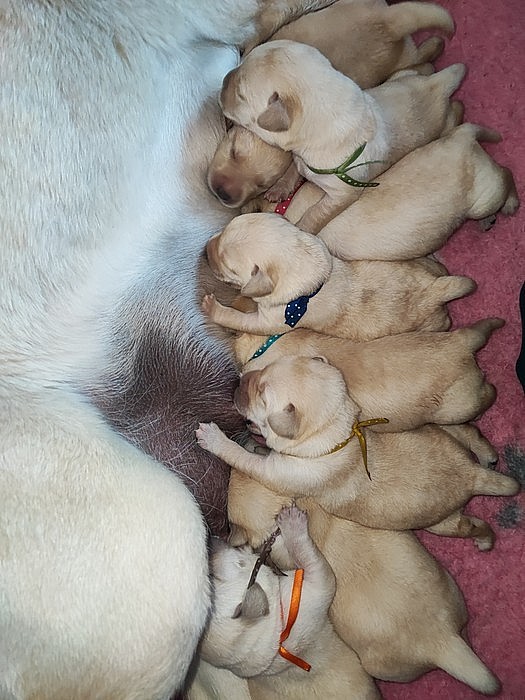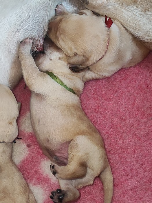 Máme štěňátka od smíška MATYLDY. Naše maminka je stále ve výborné náladě, o miminka se stará s obrovskou láskou, pečlivostí, mlíčka je od prvních okamžiků hodně, pupíky mají plné.