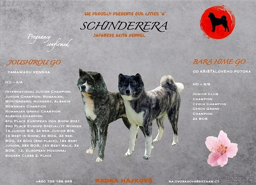 Chovatelská stanice Schinderera nabízí posledního volného pejska Akita Inu s PP po povahově skvělých rodičích. K odběru 5.8. Pejsek půjde do nového domova očkovaný, čipovaný a odčervený. Chovatelský servis a smlouva jsou samozřejmostí. Achiro je zvyklý na pestrou stravu a je socializován. Cena pejska je 30 000 Kč.. Pro více informací mne kontaktujte: 739 169 988 nebo na e-mailu: ra.dvorakova@seznam.cz.