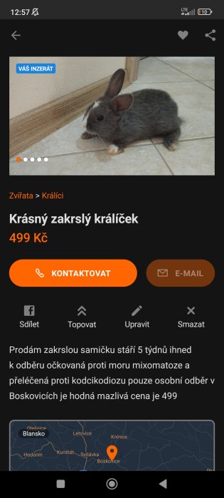 Nabízím mladé letošní samičky vhodné k připuštění, jedná se o kříženky moravského modrého, příp. burgundského králíka. Očkované na mor a myxomatózu. V...