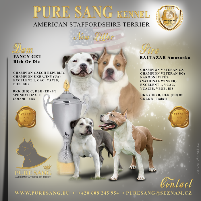Ch.ST. s dlouholetou praxí tohoto úžasného plemene, nabízí ihned k odběru do těch nejlepších podmínek, TOP odrostlejšího posledního kluka - pes krásného exteriéru, pěkné hlavy, silné kostry, v barvě modré s bílými znaky, kompletně vybavený, označený čipem, několikrát odčervený, kompletně očkovaný ( dovolená i v zahraničí) socializovaný, vymazlený, už naučený na obojek a vodítko, doma gaučing, venku rošťárny, do rodin, kynologii, sport, ochránce, na výstavy, do chovu s průkazem původu P.P.,(registrace u Kynologické Unie ČR) PET PASSEM, smlouvou, chovatelským servisem, po přátelských a zdravých, výstavně vedených rodičích, CHAMPIONECH krásy několika zemí.