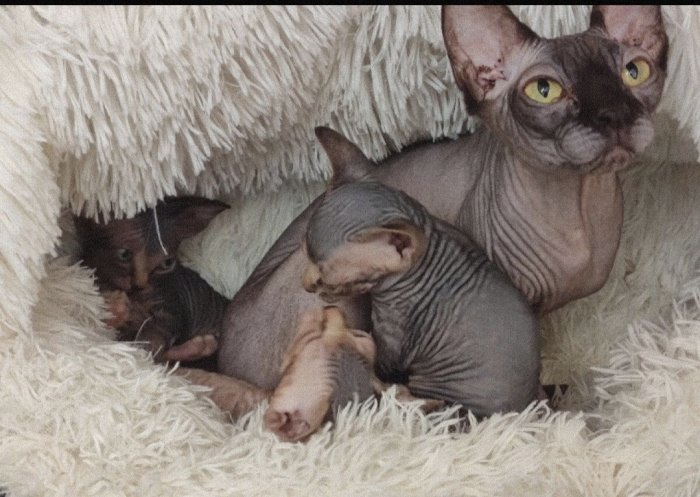 Nabízíme k prodeji Koťátka-2 kočoura a 1 kočka kanadský sphynx od papírových rodičů . Koťata se narodili se 30.03.2023.