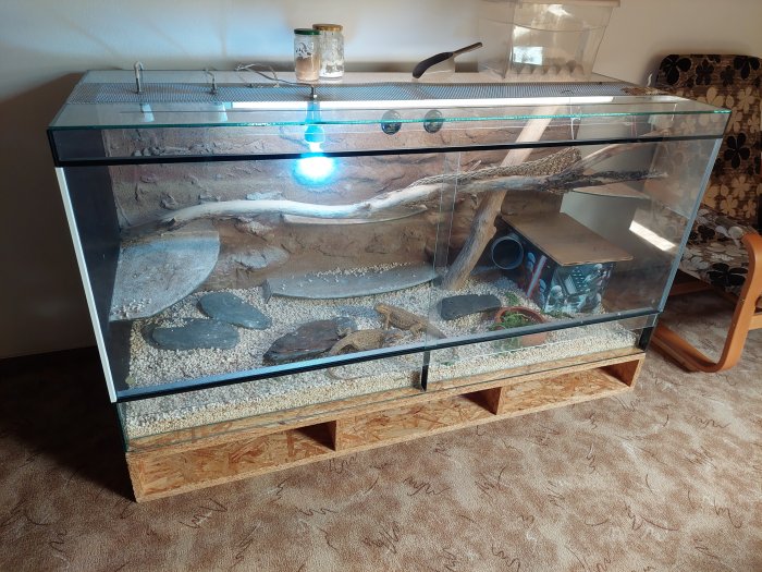 Dobrý den, prodám celoskleněné terarium s vybavením + 2x agamy vousaté - stáří cca 5 let. Velikost šířka 160 x výška 80 x hloubka 60. Vyrobené 30.9.2018