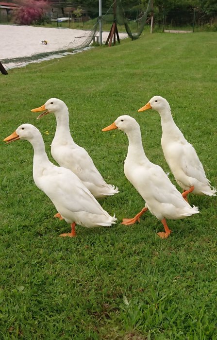 Dobrý den, nabízím čtyři kačery indického běžce bílé formy. Narozeni letos v dubnu. Jsou odchovaní od vajíčka, zvyklí na lidi, úžasní vysavači slimáků. (cena za kus)