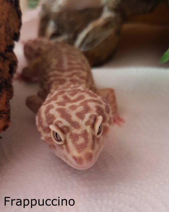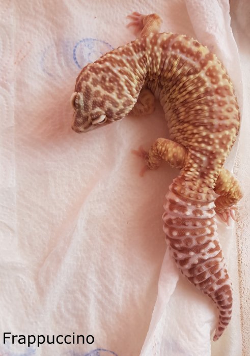 Všechny jsem pořizovala od chovatele. Frappuccino je ta, na které mi záleží úplně nejvíce a bude pro mě těžké ji předat. Je to bojovnice. Měla jsem taky zájem zkusit chov a tak jsem jí seznámila se samečkem, kterého jsem tehdy měla a vše proběhlo v pořádku a pak nakladla dvě vajíčka - bohužel nebyla oplodněna. O pár dní později jsem si ale všimla, že má nějaké problémy a snaží se něco vytlačit a bylo vidět, že je v bolestech. Vzala jsem ji na veterinu, kde se specializují i na plazy a při rentgenu se zjistilo, že má ještě třetí vajíčko a je tak obrovské, že by ho neměla šanci vytlačit a zemřela by v bolestech. Byla mi nabídnuta možnost jí zachránit operací s tím, že je velká šance, že to nezvládne, ale byla to jediná možnost, co měla, tak jsem souhlasila a přežila to. V rámci operace bylo i zařízeno, aby nemohla produkovat žádná vajíčka, aby se to nestalo znovu. Je tedy neplodná a není do chovu. A je to obrovský žrout.