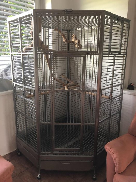 Nerezová, netoxická rohová klec na velkého papouška (Kakadu, Ara,..). Rozměry cca 120x120cm, výška včetně pojezdových koleček 182cm. Hmotnost cca 82kg. Použitá- bez vady.