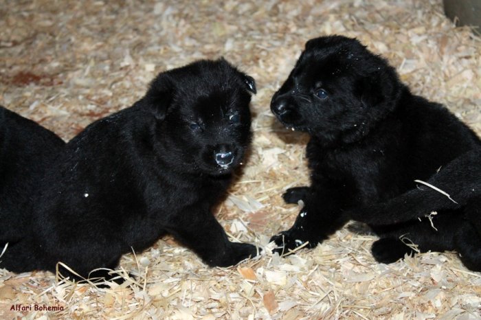 Prodám krásná celočerná a vlkošedá štěňátka německých ovčáků s PP (FCI). Výběr ze dvou vrhů. Odběr začátkem 11/2023. Předpoklad výborné povahy a pěkného exteriéru. Vhodní pro chov, výcvik i jako společníci. Více na www.alfaribohemia.com