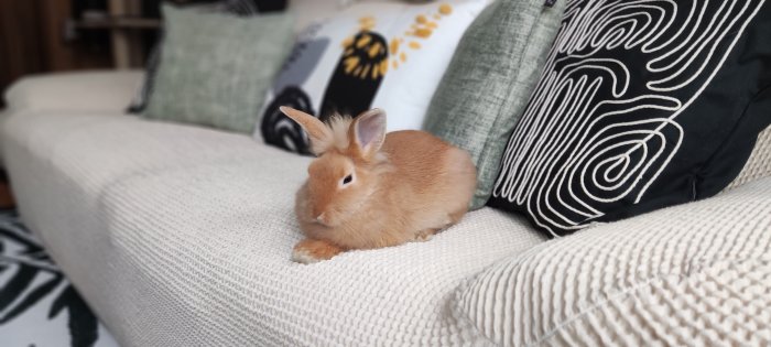 Ouško je zvídavý králíček, rád prozkoumává okolí, mimo klec radostné poskakuje a náklonnost projevuje olizováním.